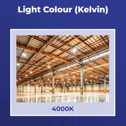 Die LED-Hallenleuchte kommt mit der Farbtemperatur 4000K - Kaltweiß daher. Als Faustregel gilt: Je höher der Kelvinwert, desto natürlicher wirkt das Licht. Dies ist besonders in Hallen ohne Tageslichteinfall wichtig.