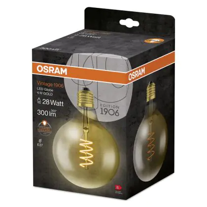Die Osram Vintage 1906 LED E27 Globe 5W 820 Gold | Ersetzt 25W ist eine moderne LED-Lampe mit Vintage-Design. Sie kann ganz einfach herkömmliche Leuchten mit einem E27-Sockel, sowie einem Verbrauch von 25 Watt, ersetzen und ermöglicht damit eine Energieersparnis von bis zu 90 %. Zudem punktet die Lampe mit einer langen Lebensdauer, leuchtet in der Farbtemperatur extra Warmweiß und besitzt einen Leuchtkörper aus Glas in der Gold-Ausführung. Die spiralförmigen Filamente im Inneren sorgen für einen originellen Look und sind ein echter Blickfang.