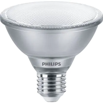 Der Philips Master Value LED Glühbirne Reflektor E27 PAR30 9.5W 740lm 25D - 927 Extra Warmweiß | Höchste Farbwiedergabe - Dimmbar - Ersatz für 75W ist ein leistungsstarker LED-Strahler mit E27-Sockel. Er kommt mit einer hohen Lebensdauer von 25000 Stunden daher und spart Ihnen somit nicht nur Energie-, sondern auch Austausch- und Wartungskosten. Im Preis ist zudem eine All-In-Garantie von 5 Jahre enthalten.